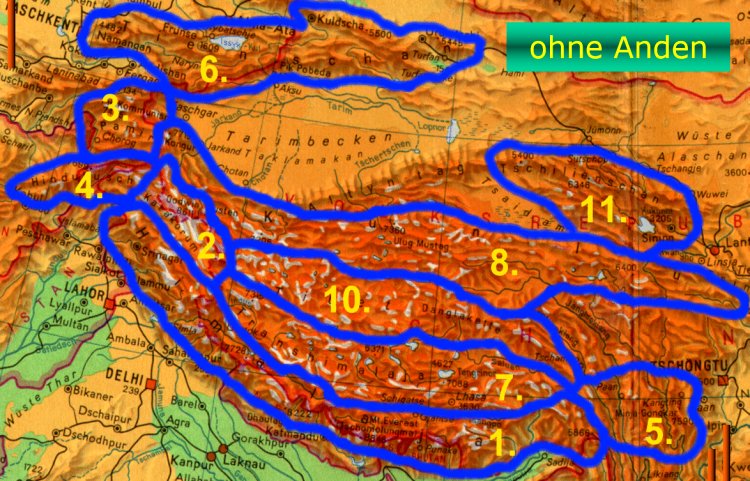 Rekordorte höchste Passstraße (SemoLa 5566m 2016), höchster Flugplatz (Daocheng 4410m 2016), höchste Fernstraße (Karakorum Highway/CN-PAK 4730m durch 4 der 6 höchsten Gebirge 2009), gr. Salzsee (Uyuni/BOL 10582km² 3653müNN 2008) , höchstes Kloster (Rongbu 5300m 2011), höchste Bahn (Tibetbahn 5072m 2006,11), gefährlichster Flugplatz (Lukla 2860müNN 527m Piste 2012), tiefster Canon (Tigersprungschlucht 3202hm 2007), gr. Staudamm +. gr. KW + gr. Schiffshebewerk (3-Schluchten-Damm 663km Rückstau 18,2MW 113hm 2006), gr. Bauwerk 1 (Chin. Mauer 2006, 07), gr. Bauwerk 2 (Kaiserkanal 2000km 50m 500v.Chr. 2007), gr. Kloster (Drepung 10000 Mönche 2007), größter Palast (Kaiserpalast 0,72qkm 9999Räume 4-mal), höchster Palast (Potala/Tibet 3800m 13 Etagen 2006,7,11), gr.Stadt (Chonqing 40Mio.Ew 2006), schnellster Zug (CRH400 2018), höchste Großstadt (Potosi 4824m 2008), gr. Schamanenmarkt (La Paz 2008), längste Bahnlinie (Transsib 2014), gr. Glasbrücke (Zhiangjiajie 430m ü. 300m 2018), gr. Tempel (Akshardam Delhi 234 Säulen), gr. Buddhastatuen (Leshan 2006), Höhlensystem mit den meisten Statuen (Longmen-Grotten 110000 in 2345 Grotten 2006), gr. Reisterrassengebiet (Lonji 2007), gr. Hafen (Shanghai 2007), tiefste Großstadt (Turpan 150muNN 2009), zentralste Metropole (Urumtschi 3Mio.Ew 2200km zum Meer 2009), gr. Pass (Jiayu >6km im Hexi-Korridor 1000km 2009), gr. Kalkterrassengebiet (Huanlong 60qkm 2700 Pools bis 5588m 2012), , ... - in Arbeit |